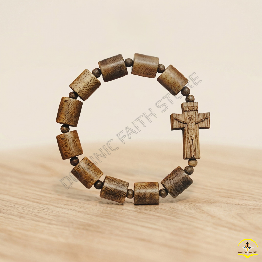 Thánh Giá gỗ sắc nét: Hình Chúa chịu nạn được chạm khắc sâu, rõ nét, là biểu tượng của tình yêu cứu độ và sự che chở thiêng liêng trên cổ tay Sếp.