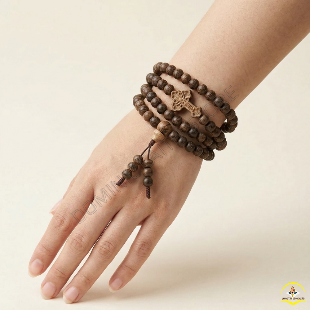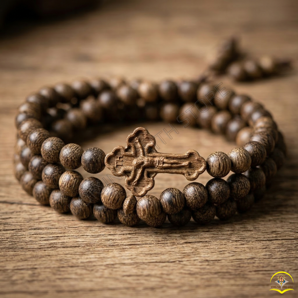 Trầm Hương Tốc Vườn luôn được ưa chuộng bởi những đường vân gỗ tự nhiên rõ rệt và độ bền cao. Khi được kết hợp cùng Thánh Giá gỗ, mẫu vòng tay này trở thành biểu tượng của sự khiêm nhường nhưng vô cùng mạnh mẽ trong Đức tin.